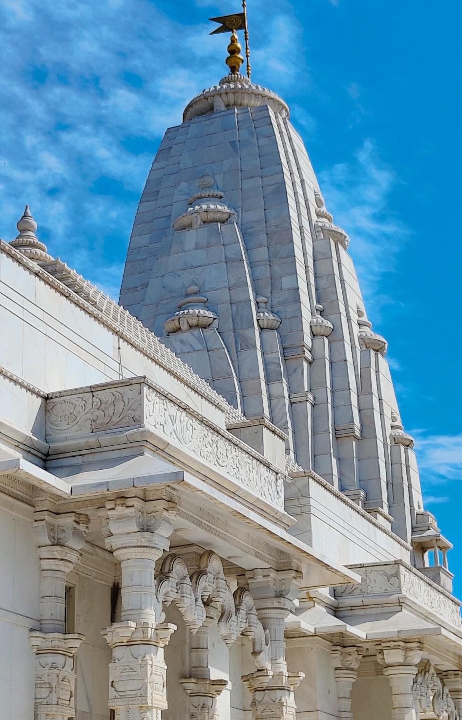Храм интересен своей эклектикой: лёгкой архитектурой в виде изящных колонн в сочетании традиционной крыши в северном индийском средневековом стиле.